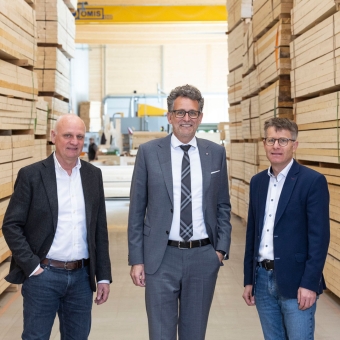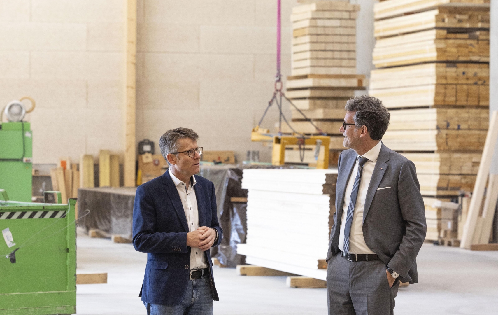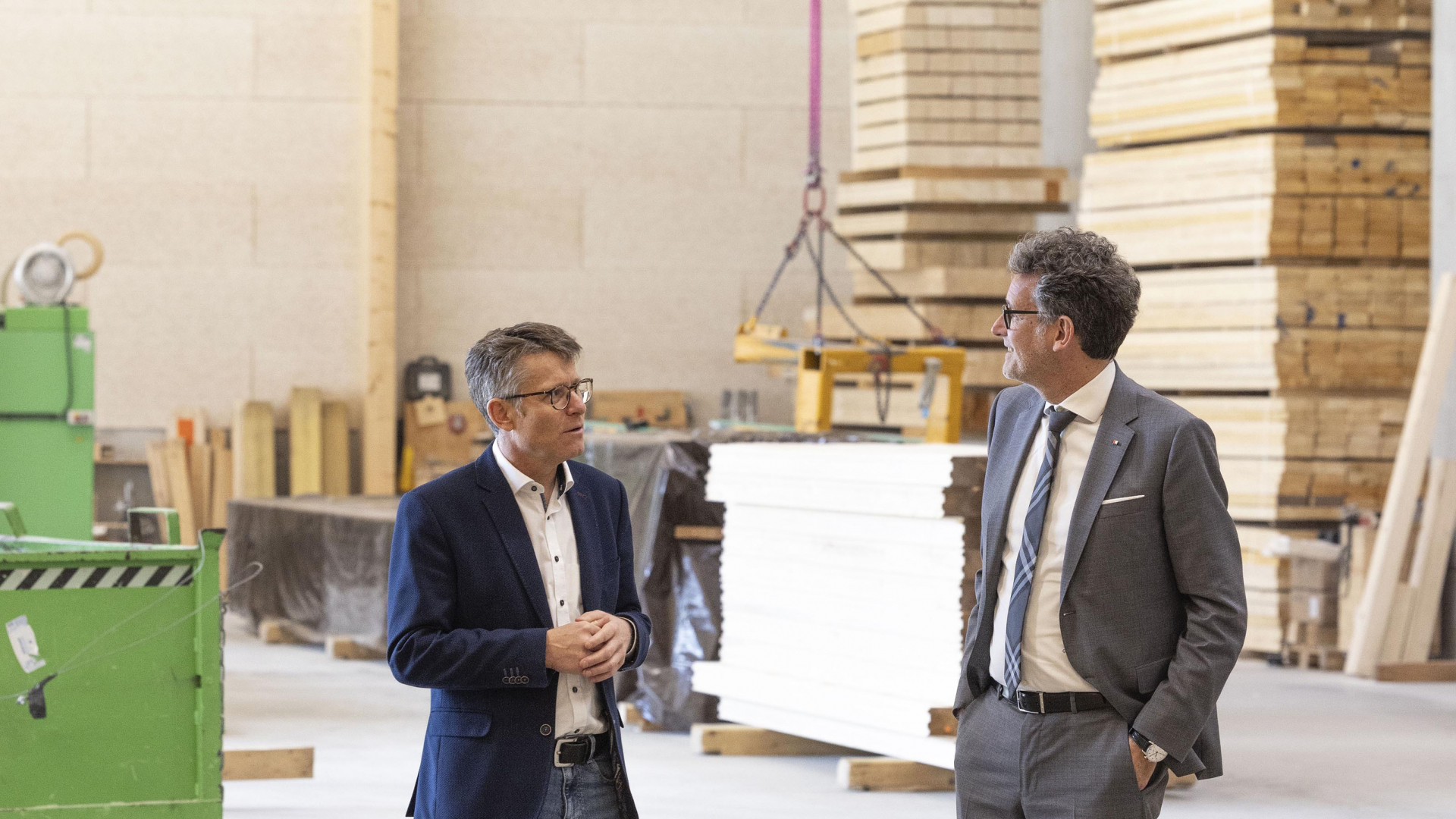 3 Männer stehen in einer Halle die mit Holz gefüllt ist