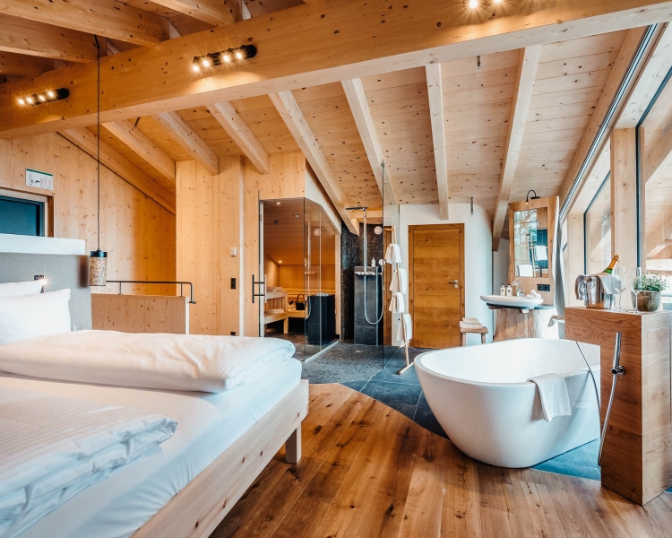 Viel Regionales wird mit einbezogen, nicht nur in der Kulinarik, sondern auch bei der Ausstattung. So sind etwa die Lampenschirme aus gepresstem Heu, die Betten aus Zirbe und es gibt Bergwasser-Trinkbrunnen in allen Zimmern.