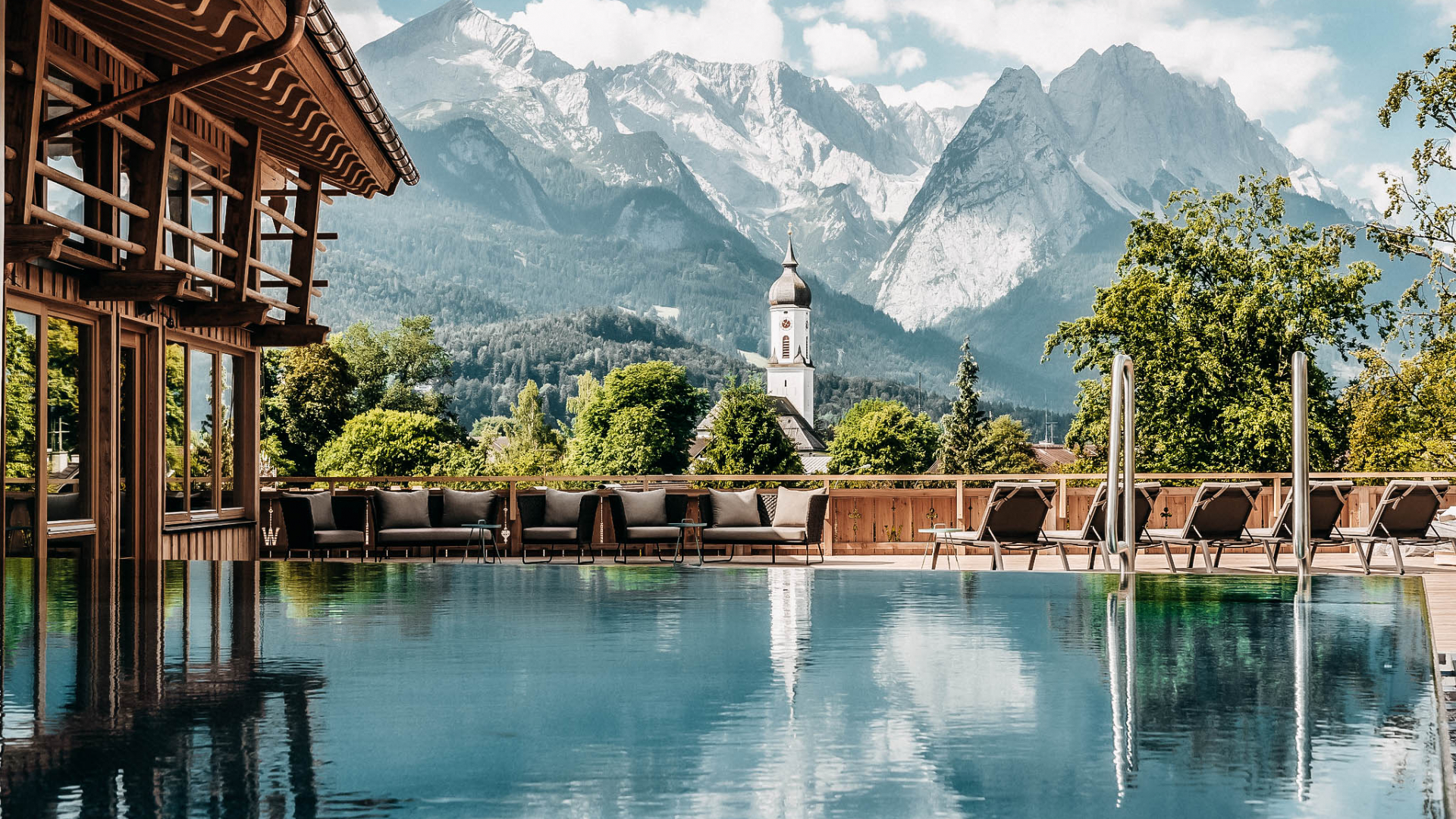 Sehr natürlich und gemütlich, modern und freundlich fügt sich das Hotel heute in den bayerischen Ort ein. Es bietet einen einzigartigen Blick auf die Zugspitze – im Pool auf der Dachterrasse etwa schwimmt man sozusagen direkt darauf zu. Im Spa „Himmel über Garmisch“ genießt man den Duft von Zirbenholz, aus dem der gesamte Bereich gebaut wurde. Die Kulinarik bietet tagsüber eine Auswahl im „Naschwerk“ an, das Restaurant „Wurzelwerk“ ist in der ganzen Region bekannt für hervorragende Küche und steht auch externen Gästen offen.