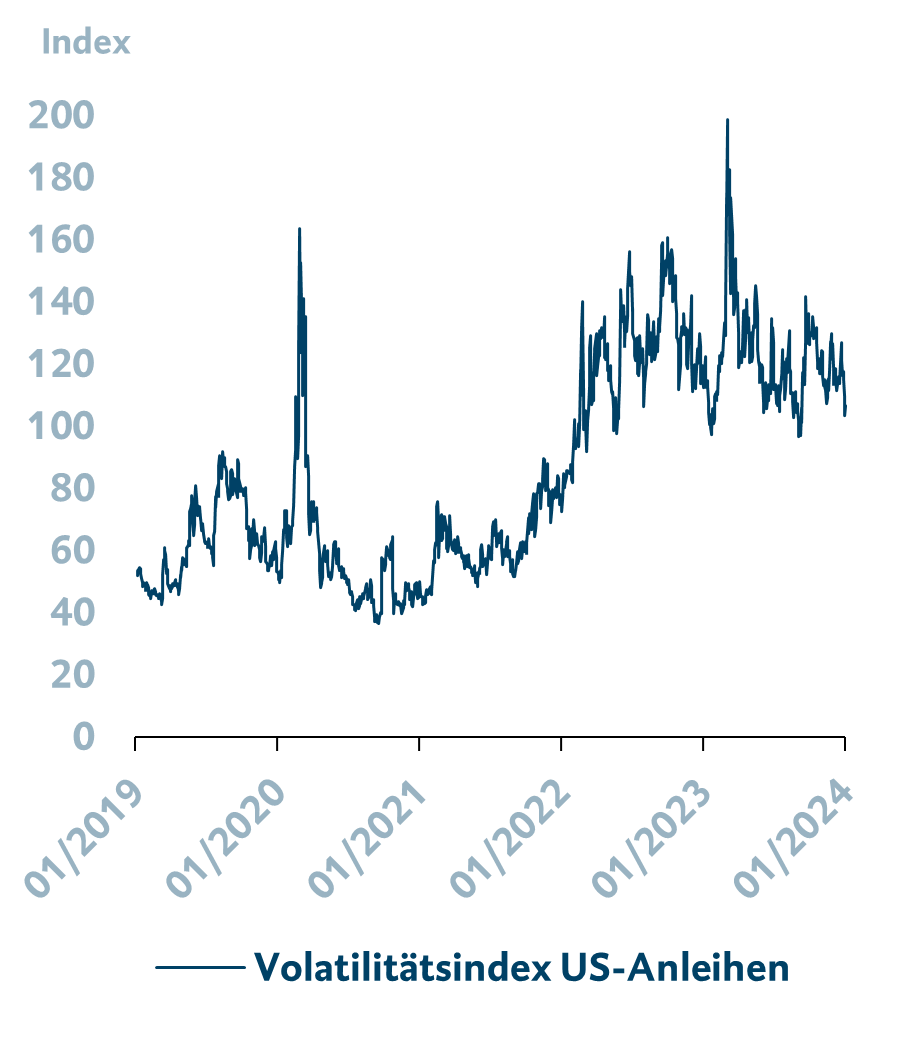 <p>Zu Jahresende ließ sich an den globalen Rentenmärkten eine Rallye beobachten, die sich für den Großteil der Kursgewinne in 2023 verantwortlich zeigte. Der Grund hierfür waren die gestiegenen Zinssenkungserwartungen an den Märkten, wodurch es auch zu fallenden Anleiherenditen kam. Wie schnell sich Markterwartungen ändern können, zeigte sich zu Anfang des Jahres 2024, als es plötzlich durch abnehmende Zinssenkungserwartungen zu einer Gegenbewegung, das bedeutet zu steigenden Anleiherenditen kam. Dieses Beispiel zeigt sehr eindrücklich, dass auch in diesem Jahr die Geldpolitik der großen Notenbanken der größte Einflussfaktor an den Rentenmärkten bleiben dürfte. Das bedeutet aber auch, dass uns die höhere Volatilität im Anleihesegment vermutlich erhalten bleiben wird. Wie in der Grafik ersichtlich, begleitet uns diese schon seit Anfang 2022. Weiterhin positiv für Anleiheinvestor* innen ist sicherlich die Tatsache, dass das aktuell höhere Zinsniveau über höhere Kuponzahlungen Kursschwankungen bis zu einem gewissen Ausmaß kompensieren kann. In der BTV sehen wir daher das Anleihesegment weiterhin als attraktive Anlageklasse und bevorzugen längere Laufzeiten.</p> <h4>Volatilität an den Anleihemärkten wird erhöht bleiben</h4> <p><img loading="lazy" decoding="async" class="alignnone wp-image-47048" src="/app/uploads/2024/01/Anleihemarkt_Volatilitaet.png" alt="Volatilität an den Anleihemärkten wird erhöht bleiben" width="300" height="343" srcset="/app/uploads/2024/01/Anleihemarkt_Volatilitaet.png 910w, /app/uploads/2024/01/Anleihemarkt_Volatilitaet-375x428.png 375w, /app/uploads/2024/01/Anleihemarkt_Volatilitaet-768x877.png 768w" sizes="auto, (max-width: 300px) 100vw, 300px" /></p> <p><span style="font-size: 12px;">Quelle: Bloomberg; Stand 16.01.2024.</span></p>