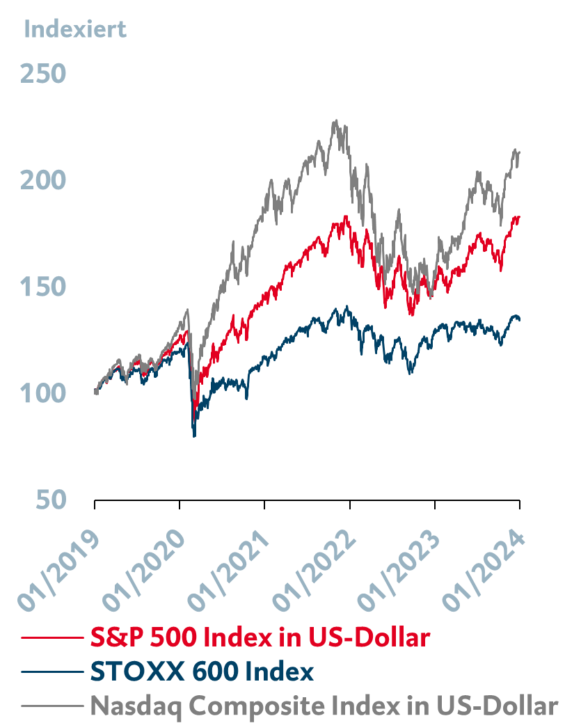 <p>Die „Risk on“-Stimmung in den letzten beiden Monaten des Jahres hob die Kursgewinne im Jahr 2023 auf ein neues Niveau an (siehe Grafik). Der US-Leitindex S&P 500 legte alleine im November und Dezember um 14,1 % zu und erzielte damit eine Jahresperformance von 26,3 %. Dem breiten europäischen Aktienindex STOXX 600 verhalf erst die Jahresendrallye zu einer zweistelligen positiven Performance, die schließlich 16,6 % ausmachte. Stark abgestrafte Titel von klein- und mittelkapitalisierten Unternehmen konnten zu Jahresende aufholen und sich im Vergleich zu den sogenannten Blue Chips sogar besser entwickeln. Zu verdanken ist diese Entwicklung den Zinssenkungsspekulationen der Marktteilnehmer* innen und dem damit tieferen Renditeniveau an den globalen Anleihemärkten. Aktieninvestor*innen fragen sich damit zurecht, was das Jahr 2024 mit sich bringen wird.</p> <h4>Jahresendrallye an den Aktienmärkten</h4> <p><img loading="lazy" decoding="async" class="alignnone wp-image-47045" src="/app/uploads/2024/01/Jahresendrallye_Aktienmaerkte.png" alt="Jahresendrallye an den Aktienmärkten" width="300" height="384" srcset="/app/uploads/2024/01/Jahresendrallye_Aktienmaerkte.png 812w, /app/uploads/2024/01/Jahresendrallye_Aktienmaerkte-375x480.png 375w, /app/uploads/2024/01/Jahresendrallye_Aktienmaerkte-768x983.png 768w" sizes="auto, (max-width: 300px) 100vw, 300px" /></p> <p><span style="font-size: 12px;">Quelle: Bloomberg; Stand 16.01.2024.<br /> Wertentwicklungen der Vergangenheit bieten keine Gewähr für künftige Ereignisse oder Wertentwicklungen. Wenn Finanzinstrumente in fremder Währung notieren, kann infolge von Währungsschwankungen die Rendite steigen oder fallen.</span></p>