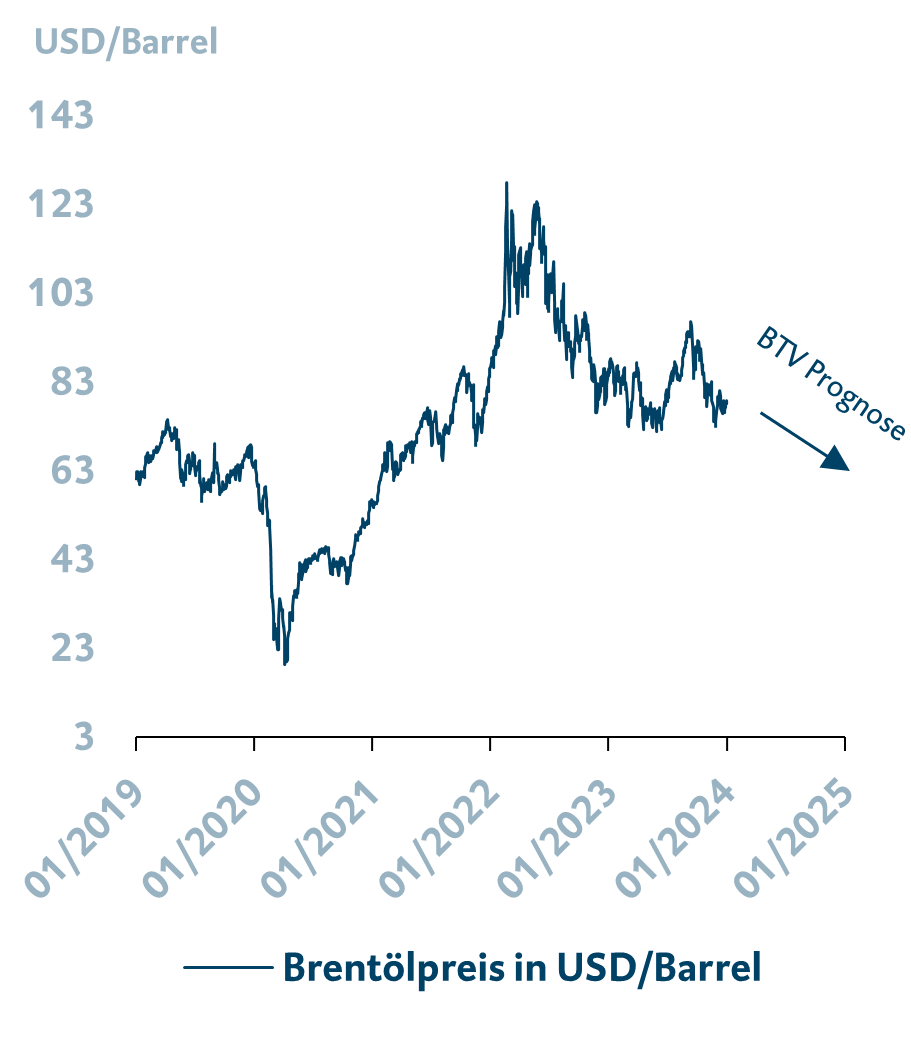 <p>Laut einem berechneten Szenario der Weltbank würde im Falle einer Eskalation des Kriegs im Nahen Osten das globale Ölangebot um sechs bis acht Mio. Barrel pro Tag fallen, was vergleichbar wäre mit der arabischen Ölblockade während des Jom-Kippur- Kriegs 1973. Die Ölpreise würden in diesem Fall ähnlich wie damals um 56–75 % und somit auf bis zu 150 US-Dollar pro Barrel ansteigen. Hierbei handelt es sich aber um ein Worst-Case- Szenario, das als äußerst unwahrscheinlich gilt. Nicht zuletzt deshalb, weil auch der Iran diesen Seeweg benötigt, um sein Öl zu exportieren, und im Falle einer Blockade drastische Einbußen erleiden würde. In der BTV erwarten wir keine dahingehende Eskalation, die das Ölangebot drastisch einschränken würde. Die Volatilität des Ölpreises ist generell hoch im Vergleich zu anderen Assetklassen und kann durch die Ereignisse im Nahen Osten immer wieder ansteigen. Ähnlich dem Basisszenario der Weltbank erwarten wir aber, dass abnehmende Wirtschaftsaktivität und eine schwächere Ölnachfrage im Vordergrund stehen und den Ölpreis in den kommenden Monaten belasten werden.</p> <h4>Nachfragesorgen drängen den Konflikt in den Hintergrund</h4> <p><img loading="lazy" decoding="async" class="alignnone wp-image-47050" src="/app/uploads/2024/01/Nachfragesorgen_Oel.png" alt="Nachfragesorgen drängen den Konflikt in den Hintergrund" width="300" height="342" srcset="/app/uploads/2024/01/Nachfragesorgen_Oel.png 911w, /app/uploads/2024/01/Nachfragesorgen_Oel-375x428.png 375w, /app/uploads/2024/01/Nachfragesorgen_Oel-768x876.png 768w" sizes="auto, (max-width: 300px) 100vw, 300px" /></p> <p><span style="font-size: 12px;">Quelle: BTV; Stand 16.01.2024.<br /> Wertentwicklungen der Vergangenheit bieten keine Gewähr für künftige Ereignisse oder Wertentwicklungen. Wenn Finanzinstrumente in fremder Währung notieren, kann infolge von Währungsschwankungen die Rendite steigen oder fallen. Bei Prognosen und Schätzungen über die zukünftige Entwicklung handelt es sich lediglich um unverbindliche Werte. Von diesen kann nicht auf die tatsächliche künftige Wertentwicklung geschlossen werden, weil zukünftige Entwicklungen des Kapitalmarktes nicht im Voraus zu bestimmen sind.</span></p>