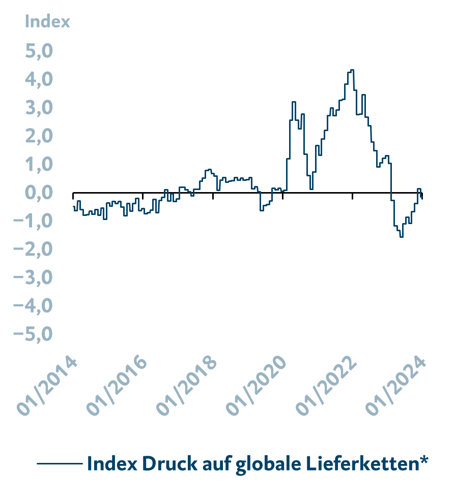<p>Die Notenbanken konnten die Inflation im vergangenen Jahr erfolgreich zurückdrängen, dennoch befindet sich die Teuerung weiterhin oberhalb des Zielniveaus von 2,0 % und muss damit im Auge behalten werden. Ein Abebben der Inflation bei Energie- und Nahrungsmitteln, intakte Lieferketten (siehe Grafik) sowie eine global niedrigere Nachfrage haben dazu geführt, dass sich der Inflationsdruck auf allen Ebenen reduziert hat. Steigende Gehälter durch einen ausgelasteten Arbeitsmarkt, höhere Mietpreise sowie steigende Kosten durch die Klimapolitik und protektionistische Maßnahmen erzeugen allerdings Gegendruck. In der BTV gehen wir davon aus, dass die Inflation zwar weiter zurückgeht, das Tempo des Rückgangs aber abnimmt und sich die Inflation langfristig oberhalb des Zielniveaus von 2,0 % einpendelt.</p> <h4>Druck auf Lieferketten hat sich seit der Coronavirus-Pandemie normalisiert</h4> <p><img loading="lazy" decoding="async" class="alignnone wp-image-47043" src="/app/uploads/2024/01/globale_Lieferketten.png" alt="Durch auf Lieferketten hat sich normalisiert" width="300" height="330" srcset="/app/uploads/2024/01/globale_Lieferketten.png 894w, /app/uploads/2024/01/globale_Lieferketten-375x413.png 375w, /app/uploads/2024/01/globale_Lieferketten-768x845.png 768w" sizes="auto, (max-width: 300px) 100vw, 300px" /></p> <p><span style="font-size: 12px;">Quelle: Bloomberg; Stand 16.01.2024.<br /> * Federal Reserve Bank of New York Global Supply Chain Pressure Index</span></p>