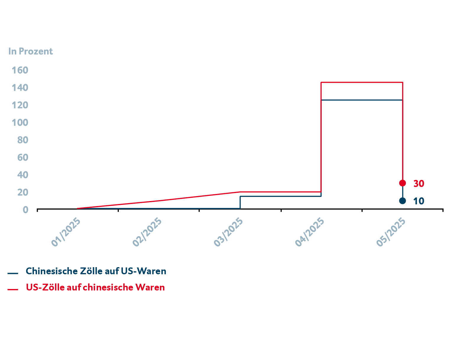 Seit dem Abverkauf nach der Einführung von Trumps Jahrhundertzöllen am 2. April, dem sogenannten „Liberation Day“, haben die internationalen Aktienmärkte eine rekordverdächtige Erholungsbewegung hingelegt. Der US-amerikanische S&P 500 hat seine Verluste seit Jahresanfang damit wieder aufgeholt, der europäische STOXX 600 steht sogar im Plus. Eine vergleichbare Entwicklung hat es bisher nur zu Zeiten der Coronavirus-Krise gegeben. Der Finanzmarkt preist bereits erfolgreiche „Deals“ zwischen den USA und ihren Handelspartnern ein, da sich die Stimmung durch den Aufschub der landesspezifischen reziproken Zölle um 90 Tage sowie durch die Einigung zwischen den USA und China schlagartig verbessert hat. Die Senkung der US-Zölle gegen China von 145 % auf 30 % war deutlich stärker als von Expert*innen erwartet (siehe Grafik 1). Aufgrund der verbesserten Stimmung an den Märkten hat auch die Bewertung zuletzt spürbar angezogen. Eine Berichtssaison für das 1. Quartal, die vor allem für die USA mit spürbar steigenden Gewinn- und Umsatzzahlen positiv ausfällt, hat ebenfalls unterstützt. Dennoch gilt es, die Risiken bezüglich der US-Handelspolitik im Blick zu behalten. Vergleicht man das aktuelle effektive US-Zollniveau von ca. 15 % mit dem Niveau von vor dem „Liberation Day“ von ca. 3 %, wird klar ersichtlich, dass dieser Anstieg auf die US-Wirtschaft drücken wird.