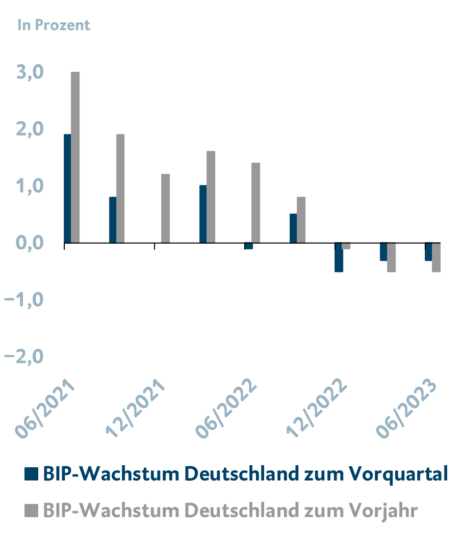 <p>Nachdem das Statistische Bundesamt das Wirtschaftswachstum im 1. Quartal nach unten revidiert hat, befindet sich Deutschland aktuell in einer sogenannten technischen Rezession. Das ist erstmal noch nicht besorgniserregend, da es sich hierbei lediglich um eine Definition handelt. Ist das Wirtschaftswachstum von zwei aufeinanderfolgenden Quartalen jeweils gegenüber dem Vorquartal negativ, handelt es sich um eine technische Rezession. Wäre das 2. Quartal nun positiv, was angesichts der Entlastung seitens der Energiepreise nicht überraschend käme, wäre es damit auch schon wieder vorbei. Doch verschiedene Konjunkturindikatoren deuten darauf hin, dass Deutschland noch eine Weile zu kämpfen hat, um sich von der Wirtschaftsschwäche zu erholen.</p> <p> </p> <h4><strong>Deutschland in der technischen Rezession</strong></h4> <p><img loading="lazy" decoding="async" class="alignnone wp-image-38938" src="/app/uploads/2023/06/BIP-WachstumDE.png" alt="" width="300" height="346" srcset="/app/uploads/2023/06/BIP-WachstumDE.png 910w, /app/uploads/2023/06/BIP-WachstumDE-375x433.png 375w, /app/uploads/2023/06/BIP-WachstumDE-768x886.png 768w" sizes="auto, (max-width: 300px) 100vw, 300px" /></p> <p><span style="font-size: 12px;">Quellen: Bloomberg, BTV; Stand 07.06.2023.</span></p> <p style="line-height: 100%;">