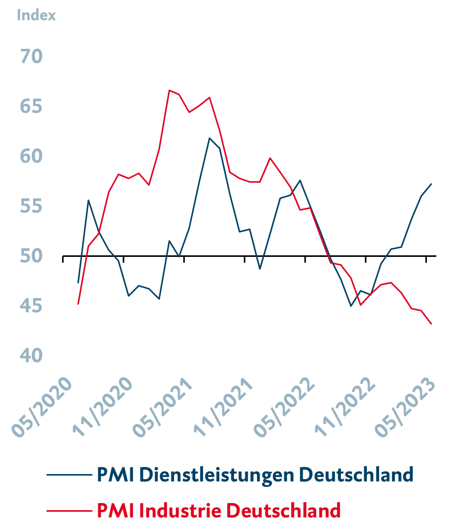 <p>Neben der Industrieproduktion wird aber auch der Konsum belastet, wie sich an den Einzelhandelsumsätzen zeigt. Hier ist es vor allem die hohe Inflation, die die Kaufkraft der Konsument*innen mindert und sie ihre Ausgaben reduzieren lässt. Außerdem sind in Deutschland verschiedene fiskalpolitische Maßnahmen, die beispielsweise als Unterstützung angesichts der hohen Energiekosten eingerichtet wurden, inzwischen ausgelaufen. Konsumiert dürfte aber dennoch weiterhin werden – hauptsächlich im Dienstleistungssektor. Der Einkaufsmanagerindex (PMI) ist nach wie vor stark und spricht für eine anhaltend hohe Nachfrage in den kommenden Monaten. Für die Industrie werden aber auch hier keine guten Zeiten in Aussicht gestellt, der PMI ist hier bereits vier Monate in Folge gefallen und befindet sich aktuell deutlich unter der 50-Punkte-Wachstumsschwelle.</p> <p> </p> <h4><strong>Ausblick für den Dienstleistungssektor deutlich besser als für die Industrie</strong></h4> <div id="attachment_38939" style="width: 310px" class="wp-caption alignnone"><img aria-describedby="caption-attachment-38939" loading="lazy" decoding="async" class="wp-image-38939" src="/app/uploads/2023/06/PMIsDE.png" alt="" width="300" height="343" srcset="/app/uploads/2023/06/PMIsDE.png 910w, /app/uploads/2023/06/PMIsDE-375x429.png 375w, /app/uploads/2023/06/PMIsDE-768x878.png 768w" sizes="auto, (max-width: 300px) 100vw, 300px" /><p id="caption-attachment-38939" class="wp-caption-text"><span style="font-size: 12px;">Quelle: Bloomberg; Stand 07.06.2023.</span></p></div>