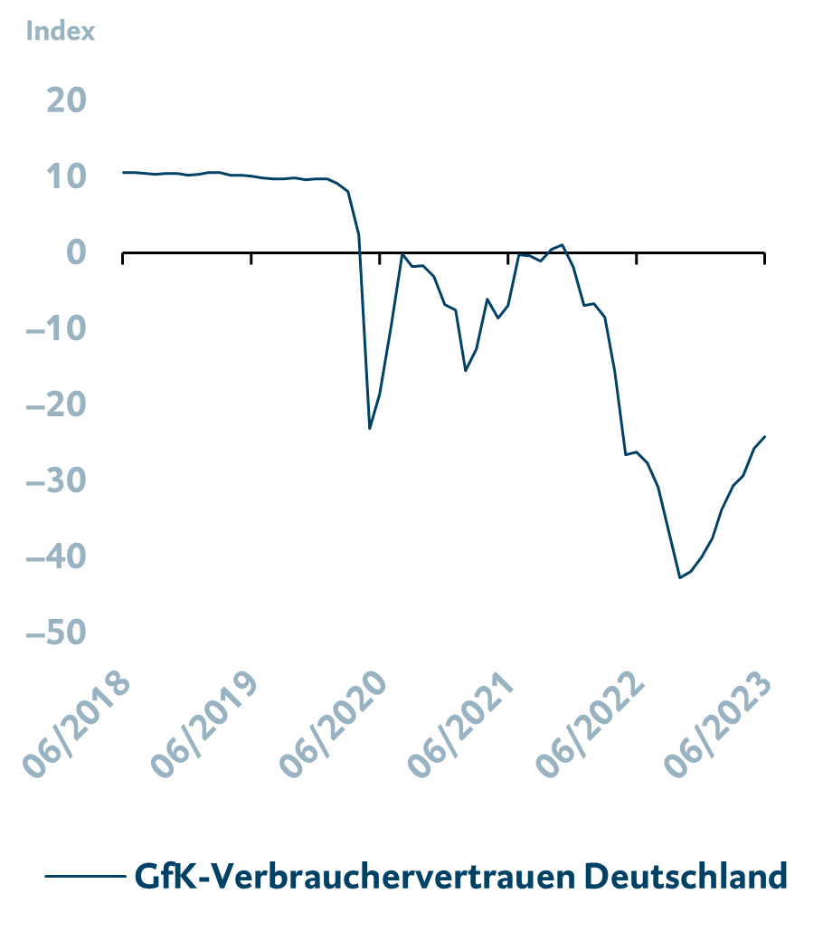 <p>Der Hauptbelastungsfaktor für die Industrie wird in den kommenden Monaten von der Zinsseite kommen. Es werden noch zwei weitere Zinsschritte seitens der EZB bis Jahresende erwartet, womit der Leitzins bei 4,5 % zu liegen kommen würde. Glaubt man den historischen Daten, vergehen im Schnitt fünf Quartale von der 1. Zinserhöhung bis zur Rezession, da sich negative Effekte auf die Wirtschaft erst nach und nach durchschlagen. Nachdem die EZB ihren ersten Zinsschritt im Juli 2022 durchgeführt hat, ist eine Rezession in Deutschland im 2. Halbjahr möglich.</p> <p> </p> <p>Was als zusätzlicher Belastungsfaktor im 2. Halbjahr hinzukommen könnte, ist eine Rezession bzw. eine weitere Wirtschaftsabschwächung in den USA. Dieser Wirtschaftsraum ist ein wichtiger Handelspartner Deutschlands, fast 10 % aller deutschen Exporte gehen dorthin. Hingegen sollte der starke Arbeitsmarkt, auch wenn dies die Unternehmen durch höhere Lohnkosten belastet, den Konsum im 2. Halbjahr wieder anziehen lassen. Allerdings nur unter der Voraussetzung, dass die Inflation weiter sinkt und sich damit das verfügbare Einkommen wieder erholt. Da das Verbrauchervertrauen, wie beispielsweise vom GfK-Institut ermittelt, aber nahe seinem historischen Tief liegt (siehe Grafik), dürfte dies die deutsche Wirtschaft zwar stabilisieren, aber nicht deutlich anschieben.</p> <p> </p> <h4><strong>Deutschlands Verbrauchervertrauen nahe historischen Tiefs</strong></h4> <div id="attachment_38941" style="width: 310px" class="wp-caption alignnone"><img aria-describedby="caption-attachment-38941" loading="lazy" decoding="async" class="wp-image-38941" src="/app/uploads/2023/06/VerbrauchervertrauenDE.png" alt="" width="300" height="343" srcset="/app/uploads/2023/06/VerbrauchervertrauenDE.png 910w, /app/uploads/2023/06/VerbrauchervertrauenDE-375x429.png 375w, /app/uploads/2023/06/VerbrauchervertrauenDE-768x878.png 768w" sizes="auto, (max-width: 300px) 100vw, 300px" /><p id="caption-attachment-38941" class="wp-caption-text"><span style="font-size: 12px;">Quelle: Bloomberg; Stand 07.06.2023.</span></p></div>
