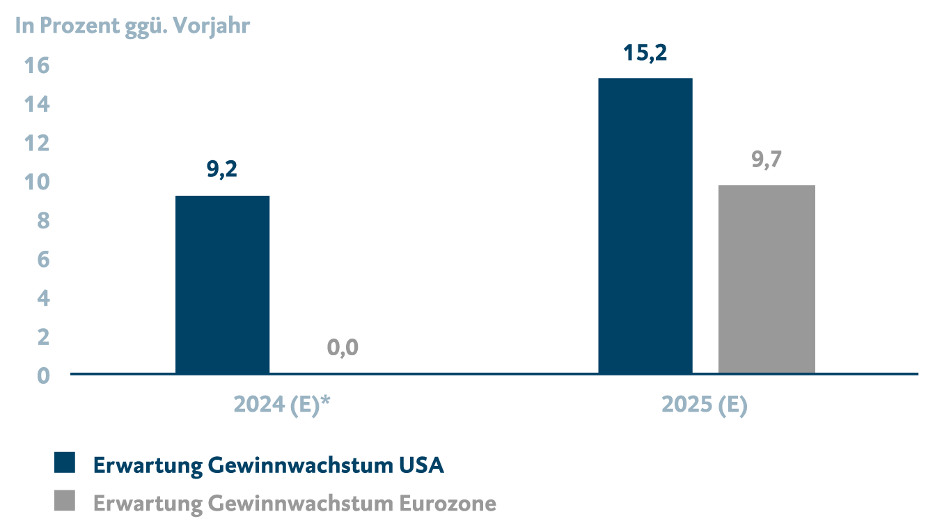Die robuste US-Konjunktur, unterstützt durch Konsument*innen in Kauflaune und investitionsfreudige Unternehmer*innen, sinkende Leitzinsen sowie steigende Unternehmensgewinne haben 2024 dazu geführt, dass sich der US-Markt im globalen Vergleich zu den Outperformern zählen darf. Die Erwartung steigender Unternehmensgewinne in 2025 (siehe Grafik), aber auch die geplanten Deregulierungen sowie Unternehmenssteuersenkungen durch den designierten US-Präsidenten Donald Trump sollten den US-Aktienmarkt auch im nächsten Jahr unterstützen. Mögliche Unsicherheiten, die im Zusammenhang mit der Handelspolitik auftreten können, sollten durch die wirtschaftsstimulierenden Maßnahmen abgefangen werden können, womit die Investitionsfreude der Unternehmer*innen erhalten bleiben sollte. Ein schwächeres Bild zeichnet sich hingegen für die Eurozone ab. Die geringere Wirtschaftsleistung, zurückhaltende Konsument*innen sowie die strukturelle Industrieschwäche Deutschlands lasten auf der Währungsunion.