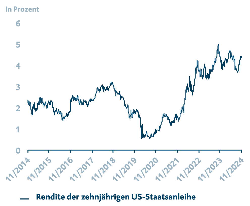 Wie bereits im Kapitel Konjunktur beschrieben, lässt uns Trumps Wahlsieg höheren Protektionismus und einige Veränderungen in der US-Politik erwarten. Er will die heimische Wirtschaft schützen und plant Steuersenkungen und Importzölle. Dies wird die US-Staatsverschuldung aber unweigerlich ansteigen lassen, was mittelfristig zu einem höheren Zinsniveau als bisher eingepreist führen wird – das betrifft sowohl die Renditen für Staatsanleihen als auch die US-Leitzinsen im Kampf gegen eine zu hohe Inflation. Unmittelbar nach dem Wahlsieg ist die Rendite der zehnjährigen US-Staatsanleihe bereits deutlich angestiegen, was sich zum Teil auch durch die geringeren Zinssenkungserwartungen an die Fed erklären lässt. Bis Jahresende rechnen wir nach wie vor mit einem weiteren Schritt, langfristig hat der Markt die Erwartungen aber etwas reduziert. Generell lässt sich sagen, dass in den kommenden vier Jahren mit deutlich mehr Unsicherheiten zu rechnen ist, als es unter einer Präsidentschaft von Kamala Harris der Fall gewesen wäre. Diese Verunsicherung an den Märkten kann auch zu einer Flucht in sogenannte „sichere Häfen“ führen, wozu auch US-Staatsanleihen zählen, was die Renditen wieder sinken lassen würde.
