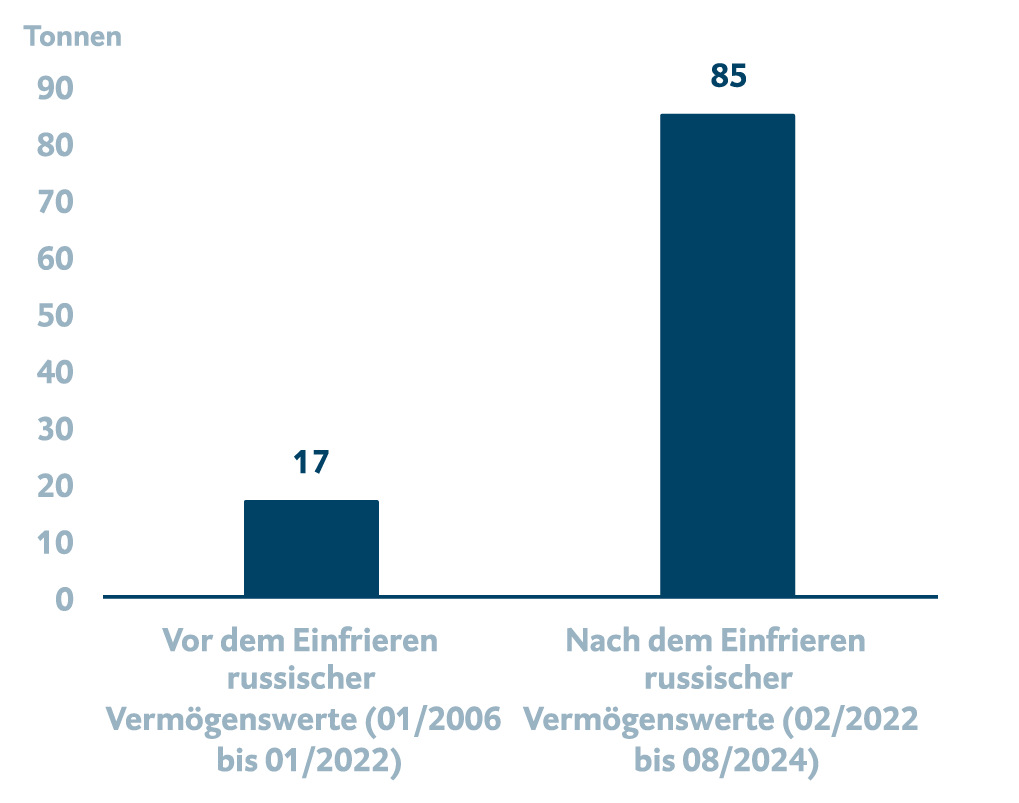 Das gelbe Edelmetall hat sich in diesem Jahr besonderer Beliebtheit erfreut und in der Spitze um über 30 % zugelegt. Konjunktur- und Inflationssorgen, die Aussicht auf niedrigere Zinsen sowie geopolitische Unsicherheiten ließen die Goldnachfrage strukturell ansteigen. Aber es sind nicht nur private Investor*innen, die das Edelmetall zu Absicherungszwecken in ihrem Portfolio einsetzen. Als besonders beliebt erweist sich Gold seit dem Einmarsch Russlands in die Ukraine im Februar 2022 bei den Zentralbanken. Denn seit dem Einfrieren russischer Vermögenswerte bei ausländischen Geldinstituten (hauptsächlich Staatsvermögen) haben sich die Goldkäufe der Zentralbanken verdreifacht. Die global gemeldeten monatlichen Zentralbankkäufe sind von ca. 17 Tonnen zwischen 2022 und 2024 recht sprunghaft auf ca. 85 Tonnen angestiegen (siehe Grafik).