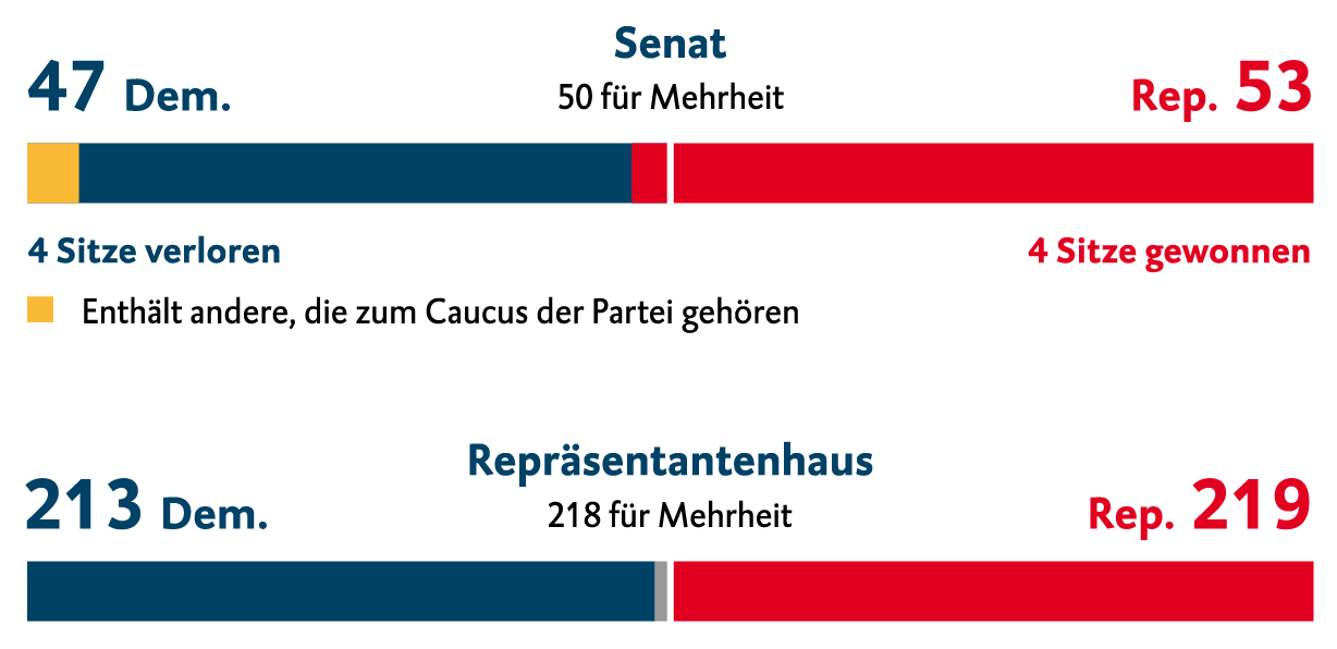 <p>Der US-Präsident ist bei der Durchsetzung seiner Agenden von der Mehrheit im Kongress abhängig – und die beiden Kammern Senat und Repräsentantenhaus sind nun beide in republikanischer Hand. Ein geteilter Kongress, wie es die letzten vier Jahre der Fall war und in dem eine Kammer von den Republikanern und die andere von den Demokraten kontrolliert wird, führt oft zu einer politischen Pattsituation, da eine Mehrheit etwa für neue Wirtschaftsprogramme schwerer zu erreichen ist. Trump ist nun aber – zumindest in den meisten Fällen – die volle Unterstützung des Kongresses sicher, was es ihm erleichtern wird, seine politischen Pläne umzusetzen. Allerdings ist bekannt, dass Donald Trump auch innerhalb seiner eigenen Partei durchaus kontrovers gesehen wird. Daher dürfte es für ihn umso schwieriger werden, seine Partei geeint hinter sich zu halten, je aggressiver seine Vorhaben sind.</p> <p><strong>Sitzverteilung im Kongress</strong></p> <lightbox-image-container original-image="/app/uploads/2024/11/BTV24_Diagramme_vol08_281_1.png"><picture class="Wysiwyg__picture"><source srcset="/app/uploads/2024/11/BTV24_Diagramme_vol08_281_1.png" media="(min-width: 1280px)" /><source srcset="/app/uploads/2024/11/BTV24_Diagramme_vol08_281_1.png.webp" type="image/webp" media="(min-width: 1280px)" /><source srcset="/app/uploads/2024/11/BTV24_Diagramme_vol08_281_1.png" media="(min-width: 1024px)" /><source srcset="/app/uploads/2024/11/BTV24_Diagramme_vol08_281_1.png.webp" type="image/webp" media="(min-width: 1024px)" /><source srcset="/app/uploads/2024/11/BTV24_Diagramme_vol08_281_1-1024x497.png" media="(min-width: 768px)" /><source srcset="/app/uploads/2024/11/BTV24_Diagramme_vol08_281_1-1024x497.png.webp" type="image/webp" media="(min-width: 768px)" /><source srcset="/app/uploads/2024/11/BTV24_Diagramme_vol08_281_1-768x373.png" media="(min-width: 375px)" /><source srcset="/app/uploads/2024/11/BTV24_Diagramme_vol08_281_1-768x373.png.webp" type="image/webp" media="(min-width: 375px)" /><source srcset="/app/uploads/2024/11/BTV24_Diagramme_vol08_281_1-375x182.png" media="(min-width: 0px)" /><source srcset="/app/uploads/2024/11/BTV24_Diagramme_vol08_281_1-375x182.png.webp" type="image/webp" media="(min-width: 0px)" /><img loading="lazy" decoding="async" class="alignnone" src="/app/uploads/2024/11/BTV24_Diagramme_vol08_281_1-150x150.png" alt="Balkendiagramm Senat USA" width="616" height="299" /></picture></lightbox-image-container> <p><span style="font-size: 12px;">Quelle: BTV; Stand 21.11.2024</span></p>