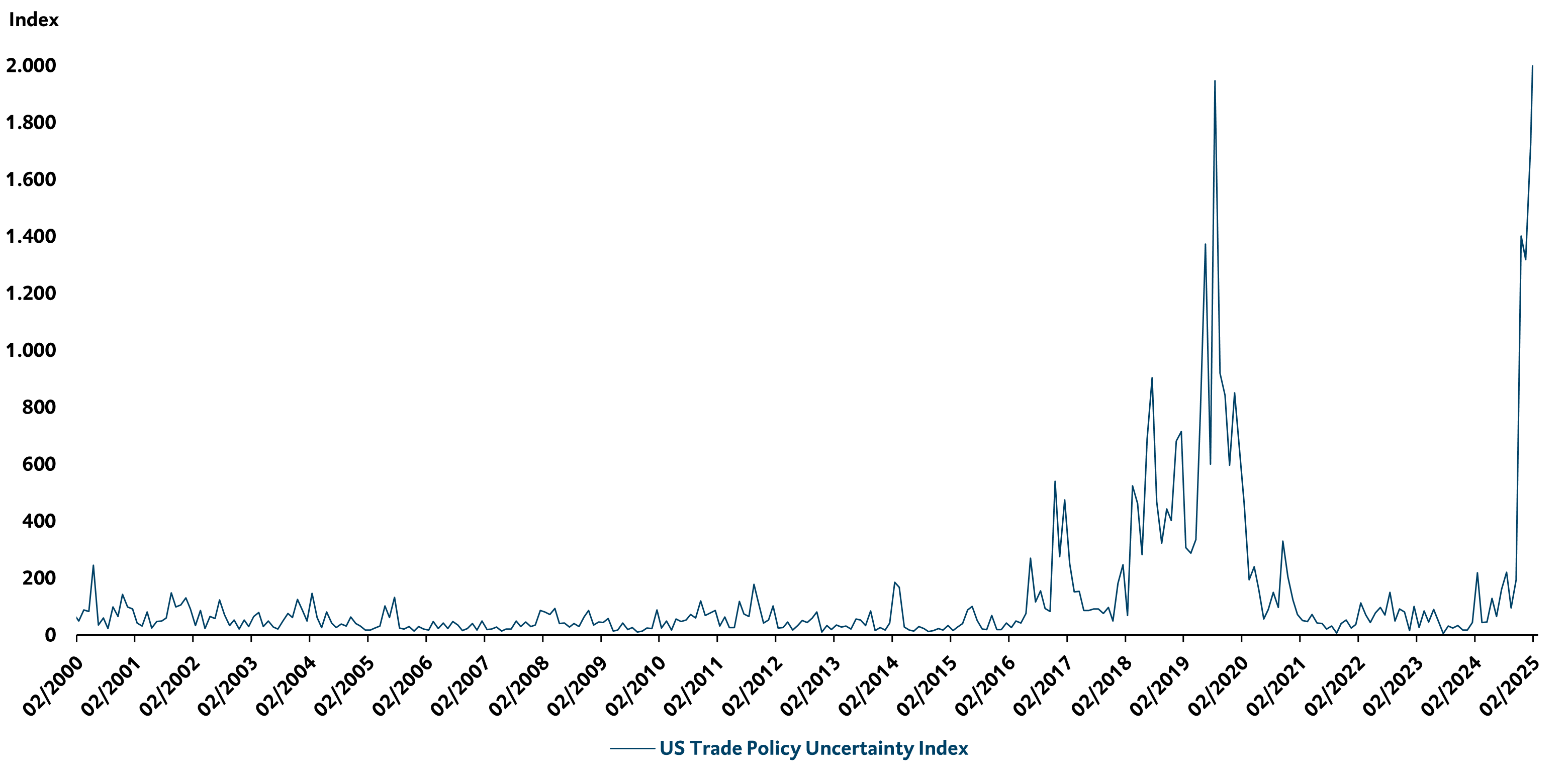 Die größte Problematik, die aus der protektionistischen US-Handelspolitik entsteht, ist die daraus resultierende Unsicherheit, die infolge dieser neuen Zölle dramatisch angestiegen ist. Der US Trade Policy Uncertainty Index misst die wirtschaftspolitischen Unsicherheiten in den USA anhand verschiedener Indikatoren wie Zeitungsnews, Ankündigungen der US-Notenbank Fed oder ähnliches. Dieser hat im Februar beinahe den Stand von 2020 während des Ausbruchs des Coronavirus erreicht (siehe Grafik).