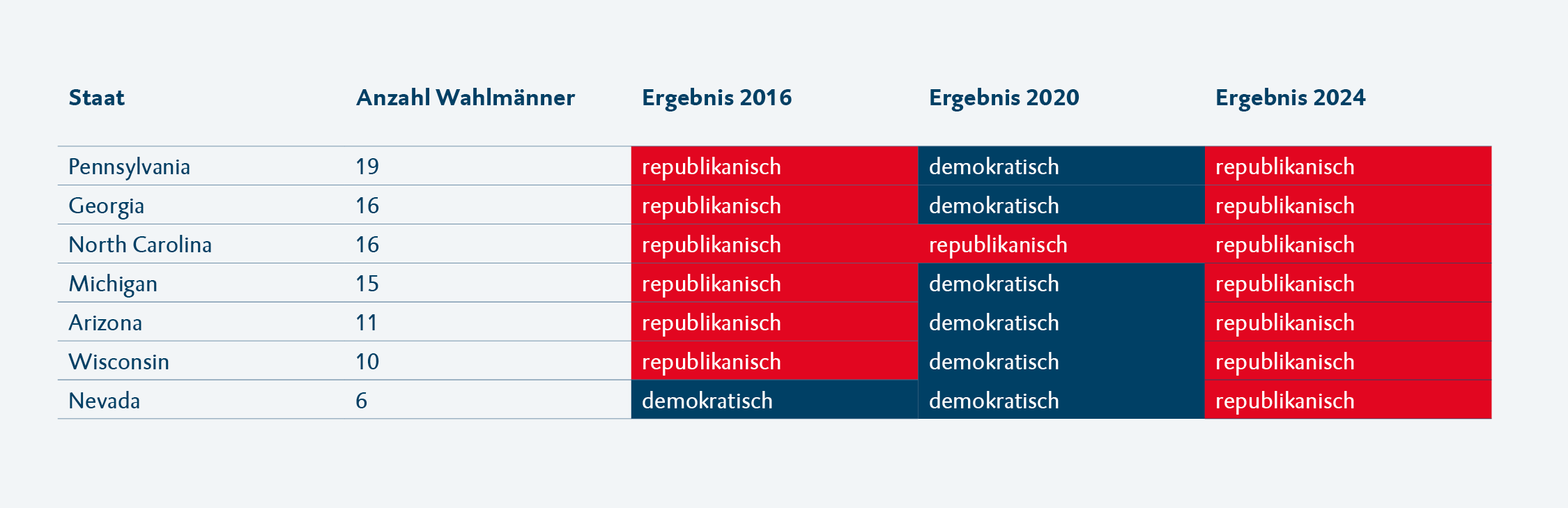 Für den Wahlsieg sind traditionell die sogenannten „Swing States“ die Entscheidungsträger, in denen im Vorfeld nie ganz klar ist, ob sie mehrheitlich demokratisch oder republikanisch wählen. Dazu gehören Pennsylvania, Michigan, Wisconsin, Arizona, North Carolina, Nevada und Georgia. Nach aktuellem Stand sieht es so aus, als konnte Donald Trump alle diese Staaten für sich entscheiden, wobei die Stimmen noch nicht überall vollständig ausgezählt sind.
