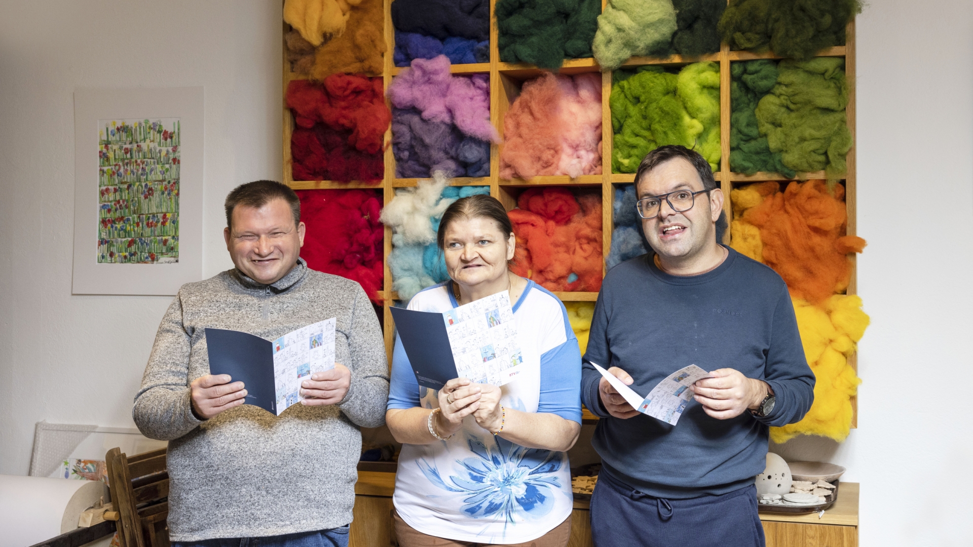 Die Künstler*innen der Werkerei. Von Josef (rechts im Bild) stammt die Illustration der BTV Weihnachtskarte 2023.
