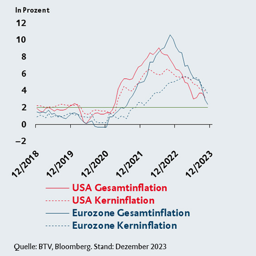 Andererseits darf man nicht vergessen, dass der Arbeitsmarkt sowohl in der Eurozone als auch in den USA sehr gut ausgelastet ist und damit Konsum und Investitionen weiterhin unterstützt werden. Wenn die Geldpolitik zu schnell wieder gelockert wird, bestünde durchaus das Risiko einer erneut steigenden Inflation.