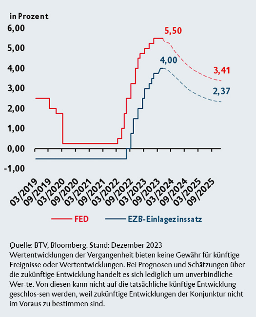 In der BTV gehen wir bereits im nächsten Jahr von ersten Zinssenkungen durch Fed und EZB aus, prognostizieren allerdings ein vorsichtiges Vorgehen. Auch wenn wir in der BTV erwarten, dass der Höhepunkt der Leitzinsen hinter uns liegt, prognostizieren wir nur langsame Zinsrückgänge, die sich hauptsächlich auf das 2. Halbjahr 2024 konzentrieren.