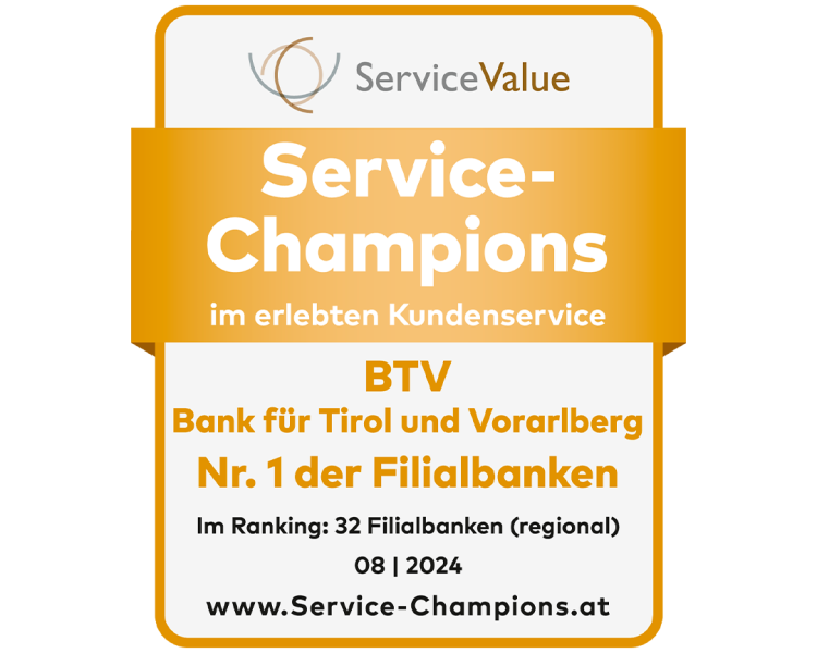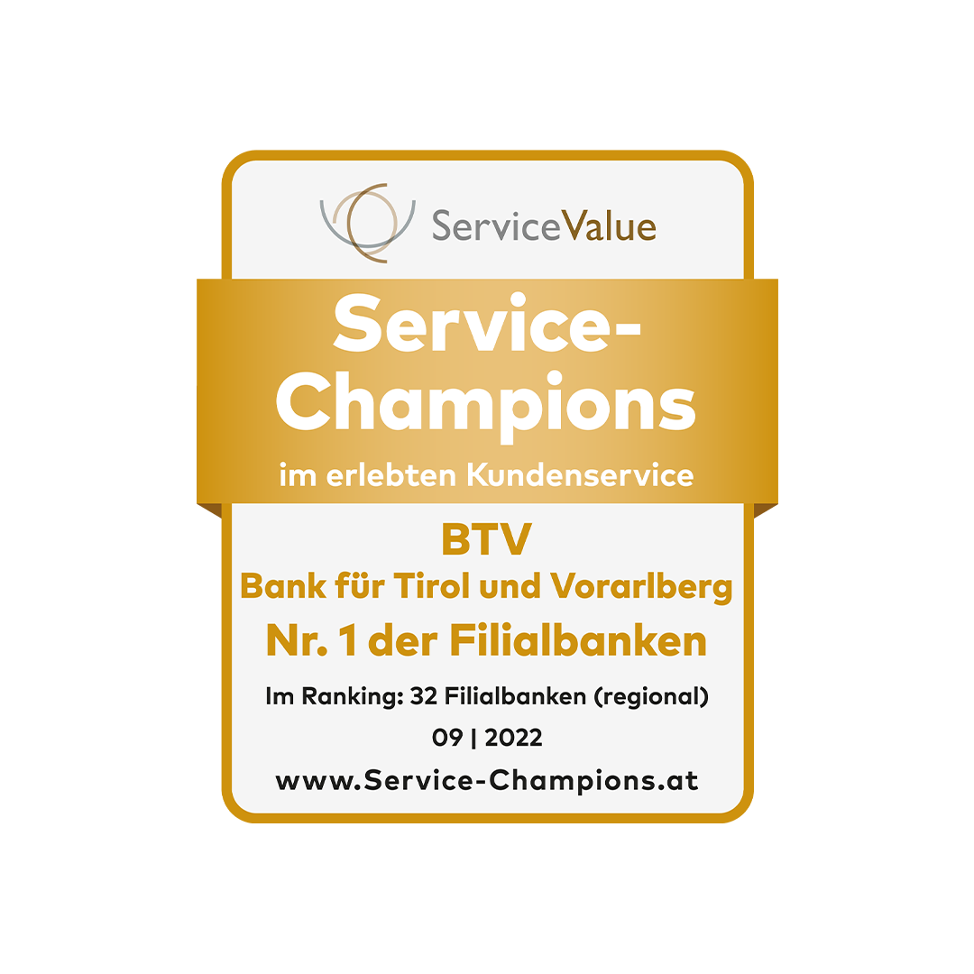 Bei der Verleihung der 19. FMVÖ-Recommender-Awards wurde die BTV gleich doppelt ausgezeichnet. Wir freuen uns über den Recommender-Sonderpreis „Aufsteiger des Jahres“. Die Steigerung der Weiterempfehlungsrate um 32 Prozentpunkte gegenüber dem Vorjahr war ausschlaggebend für diese spezielle Auszeichnung. Dies bedeutet den höchsten Zuwachs in der Kundenzufriedenheit unter allen untersuchten Unternehmen. Zudem erreichten wir den sensationellen 1. Platz in der Kategorie der überregionalen Banken. Die Auszeichnung gilt als „Oscar der Finanzbranche“.