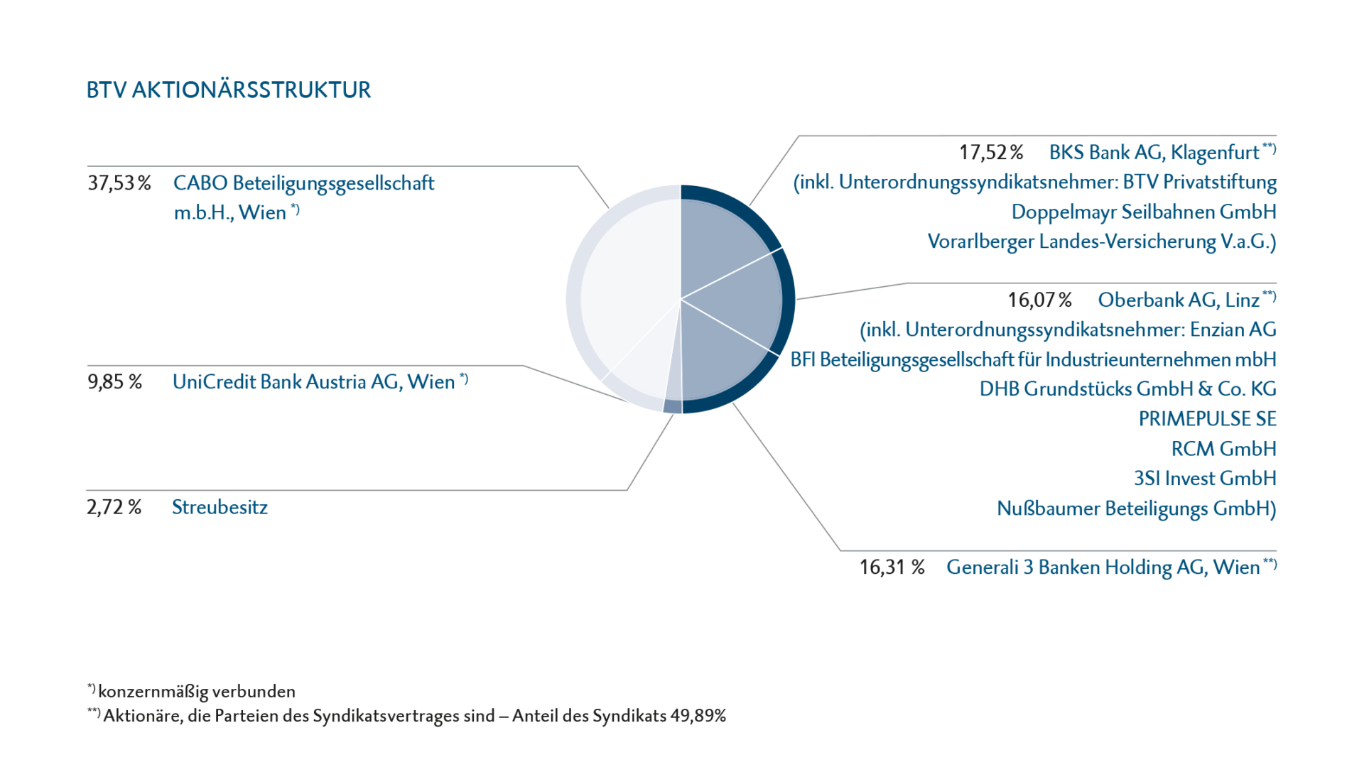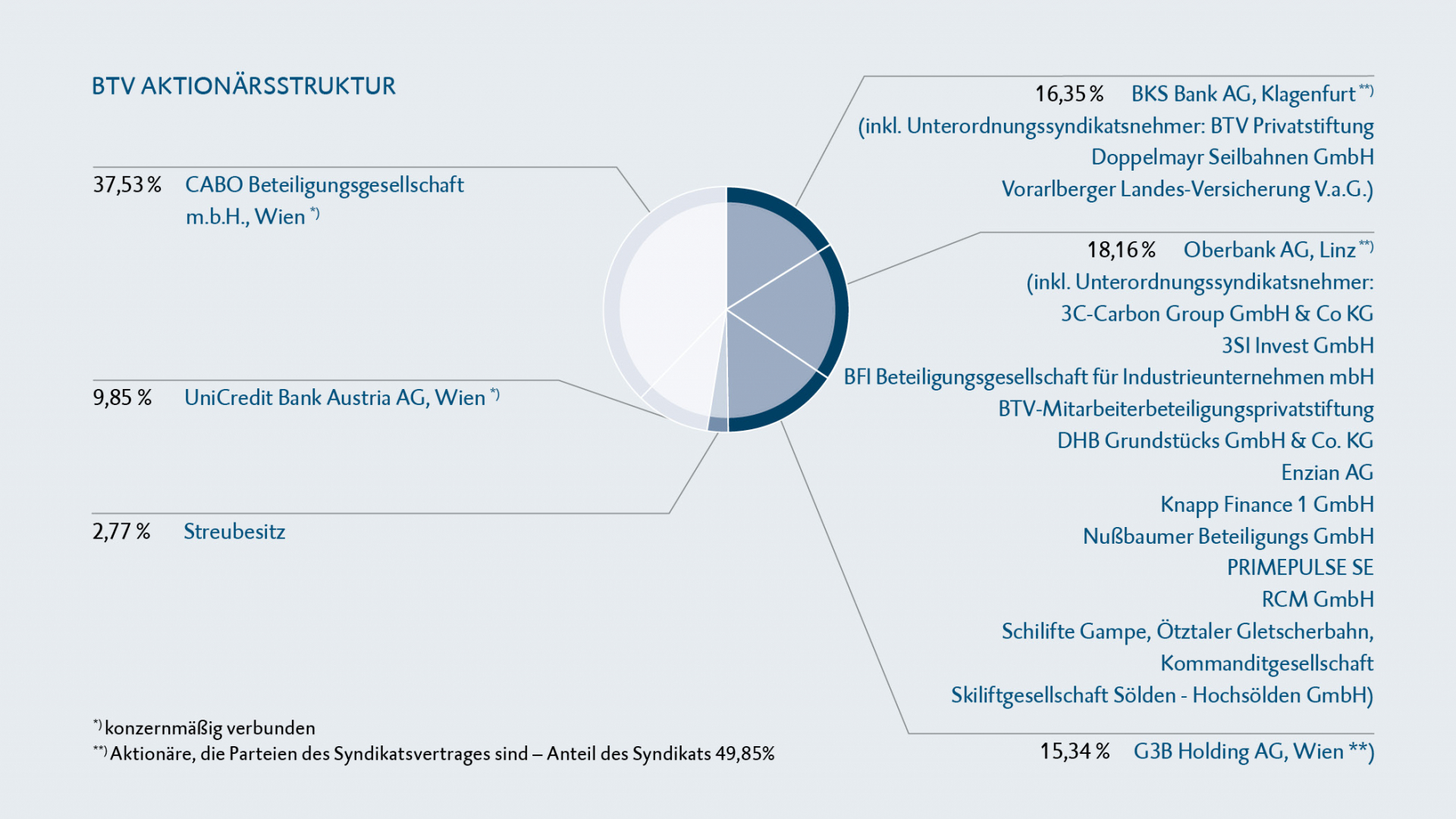 Welche Eigentümerstruktur passt zu einer Bank, die sich durch Unabhängigkeit, Offenheit und Nähe zu ihren Kund*innen auszeichnet? 1986 entschied sich die BTV, ihre Eigentümerstruktur zu öffnen und den Weg an die Börse zu gehen. Damit entschied sie sich bewusst auch für Transparenz und laufende umfassende Rechtfertigung ihrer Tätigkeit. Nicht zuletzt die sehr ernst genommene Verantwortung gegenüber unseren Aktionären hat die BTV zu einem höchst gewinnbringenden Unternehmen gemacht.